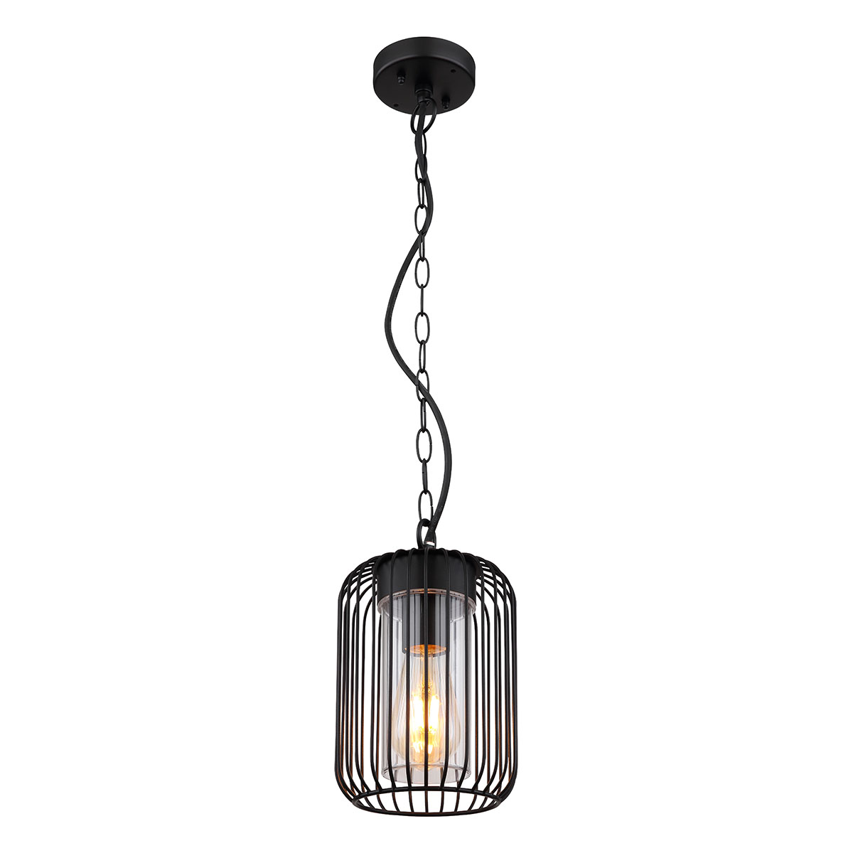 Descubre la elegancia refinada de esta lámpara de exterior de acero inoxidable, caracterizada por su acabado negro mate continuo. La lámpara cuelga de una elegante cadena de metal, con una longitud de 75,5 cm, desde un soporte de techo redondo y termina en una pantalla bellamente formada de varillas metálicas negras (Ø16 cm). Elige la intensidad y el color de luz deseados con el conector E27 – hasta un máximo de 15 vatios. Para una larga vida útil y un considerable ahorro de energía, se recomienda el uso de bombillas LED.