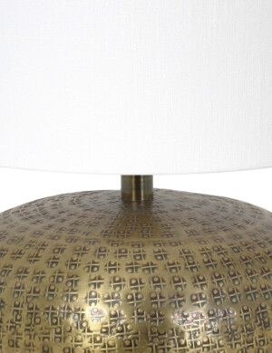 El cuidado diseño de esta lámpara se amolda a la identidad de espacios de estilos oriental, clásico, moderno o ecléctico. Se trata de un elaborado jarrón de bronce convertido en lámpara, para ofrecer un detalle innovador y destacado a la decoración del salón, el recibidor o la superficie del aparador. En cualquier caso, combina con elementos decorativos dorados y blancos.