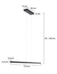 La lámpara colgante Light Stripe de la serie Danske es una adición moderna y minimalista a tu interior. La lámpara cuenta con una tira LED reemplazable de 20 vatios, con una temperatura de color de 2700 Kelvin y una salida de luz de 2000 lúmenes. La altura se puede ajustar durante la instalación de 20 a 125 cm, de modo que se adapte perfectamente sobre una mesa de comedor o espacio de trabajo. Gracias al regulador integrado entre los cables de suspensión, puedes ajustar fácilmente el brillo a la atmósfera deseada.