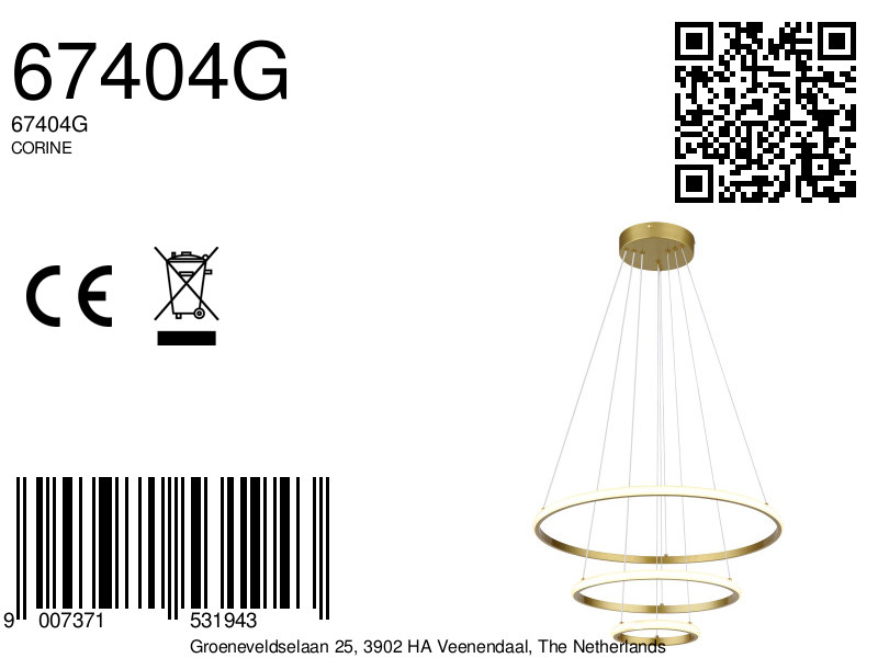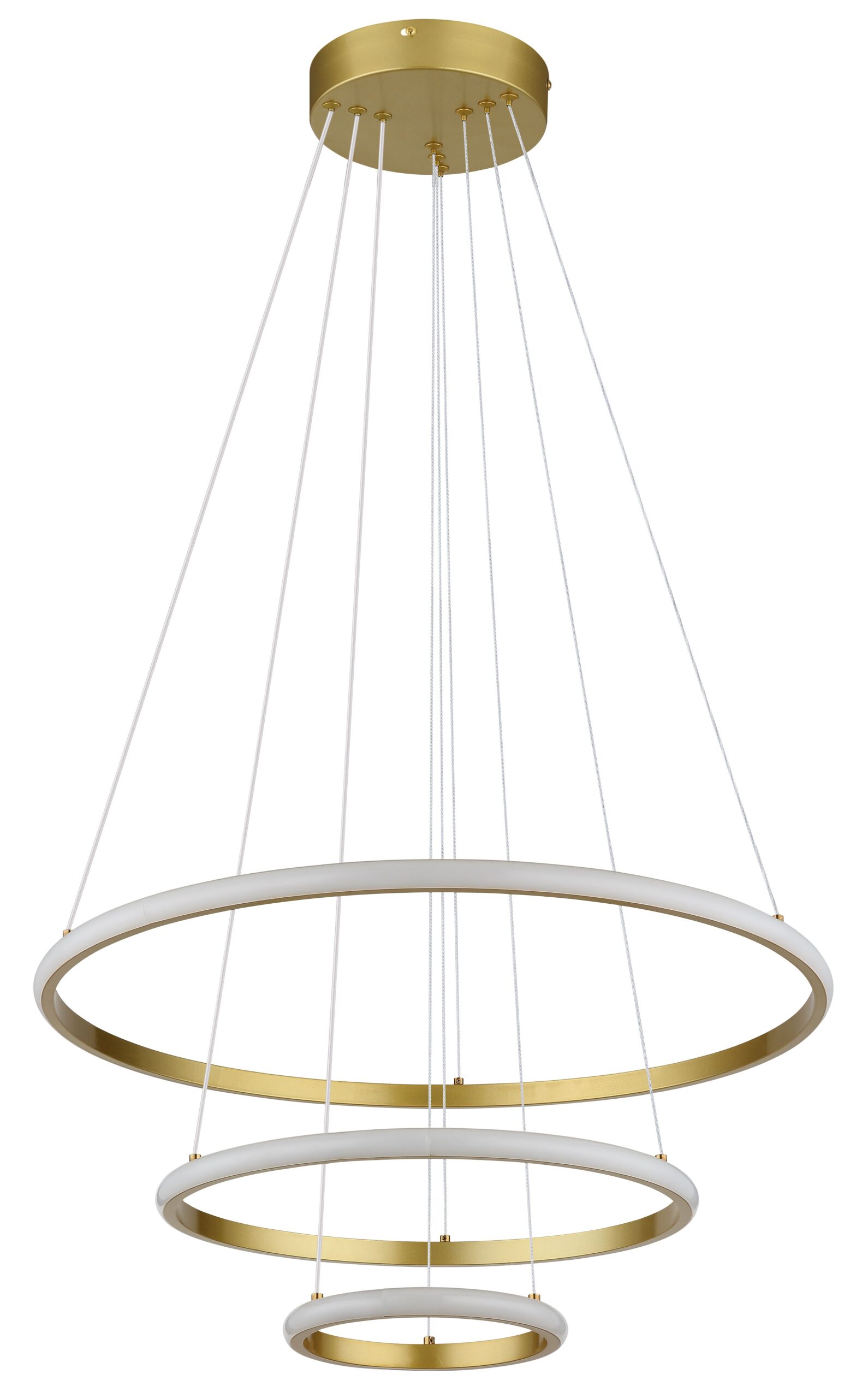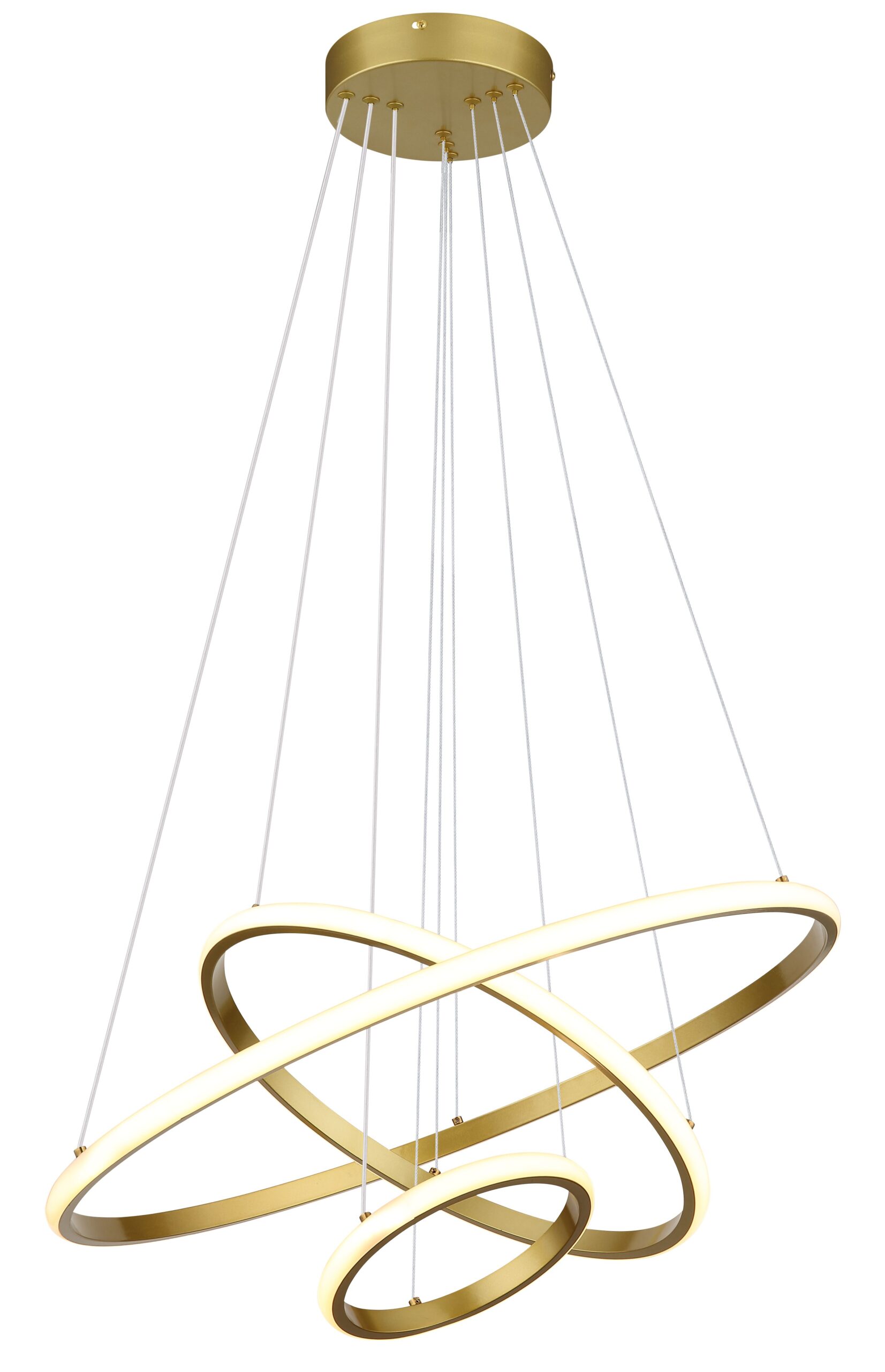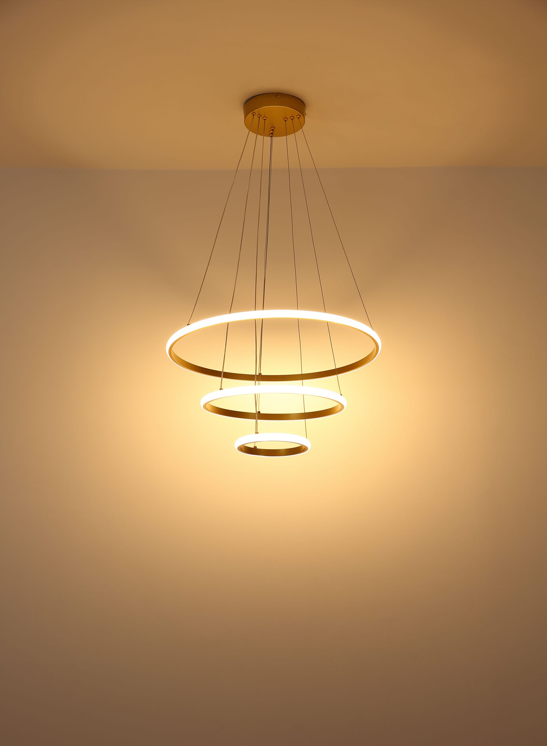 La lámpara colgante CORINE es una adición elegante a cualquier interior, que te permite añadir acentos elegantes a cada espacio. Con su forma redonda y tres anillos dispuestos de manera única, esta lámpara irradia modernidad. Fabricada con metal mate de color dorado lujoso, la lámpara no solo ofrece un aspecto chic, sino que gracias a la combinación de metal y plástico opalino, también proporciona una agradable distribución de la luz. Con un diámetro de 600 mm, la lámpara colgante CORINE es perfecta para habitaciones más grandes como salones y comedores.