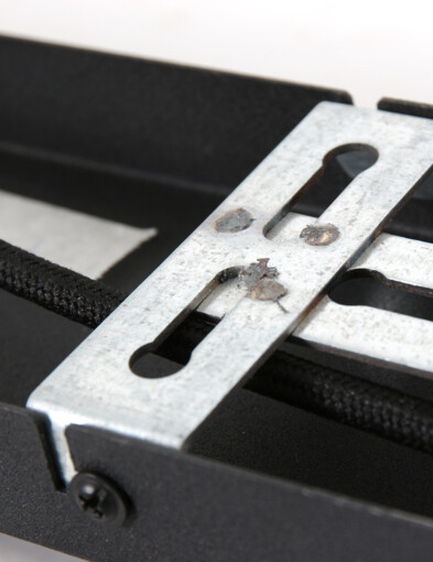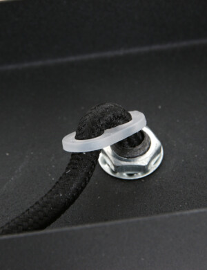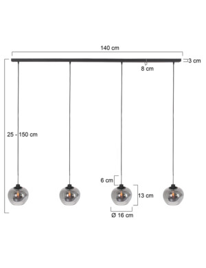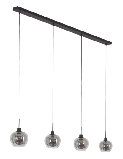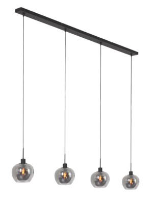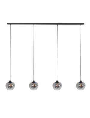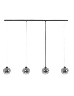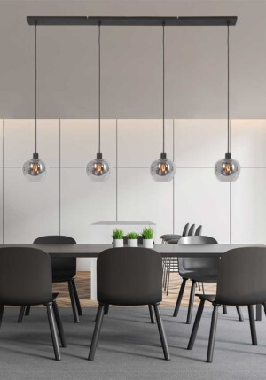 En esta versión, la lámpara con pantalla difusora de cristal ahumado Lotus, que evidencia una elegante forma de pecera invertida, se ha utilizado para conseguir una lámpara de techo con cuatro puntos de luz. Dotada de bombillas de filamento, es ideal para una mesa de comedor rectangular para varios comensales, y también para iluminar distinguidos espacios comerciales.
