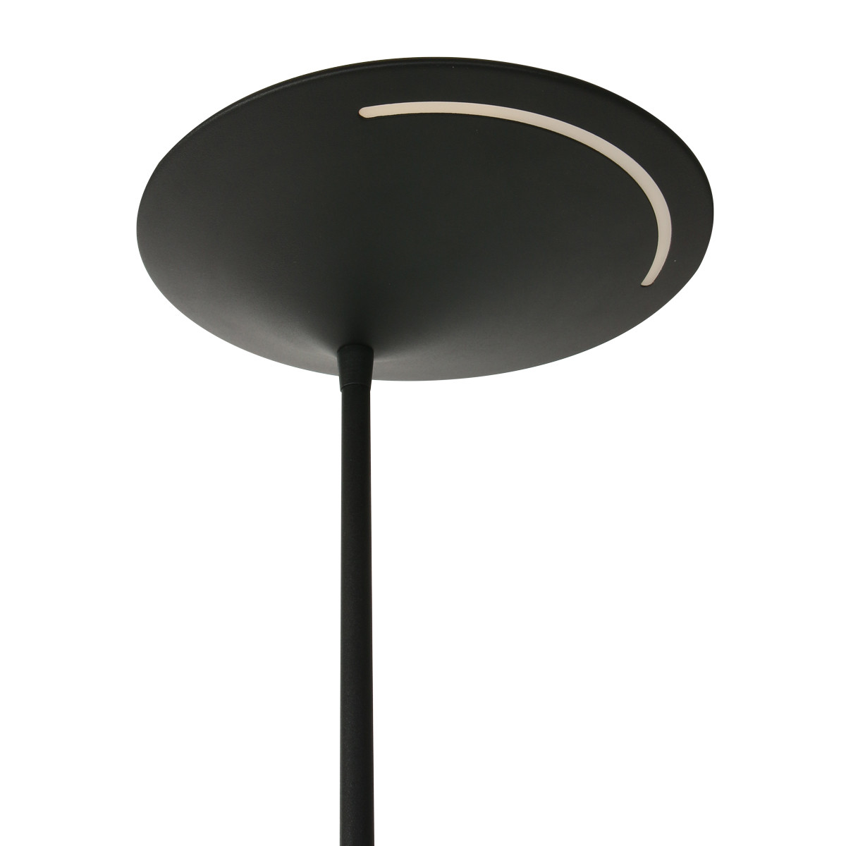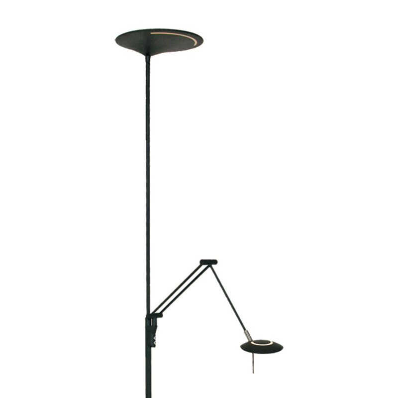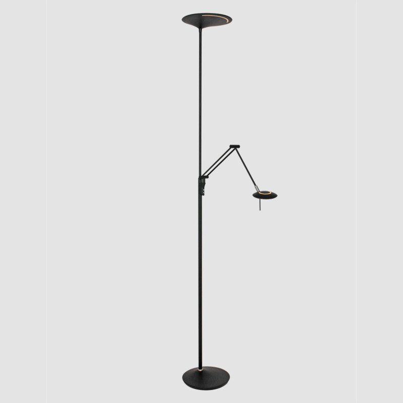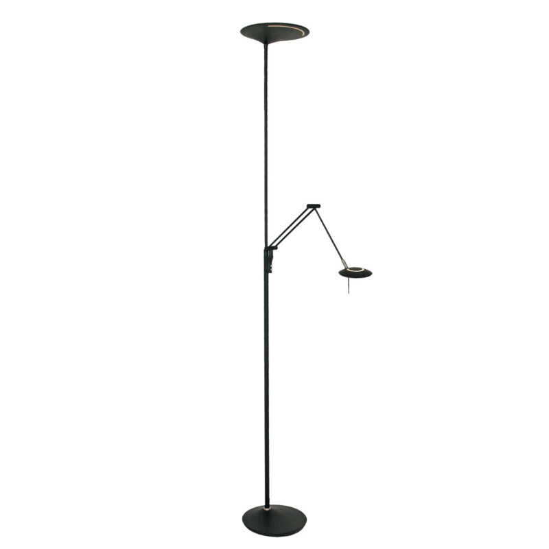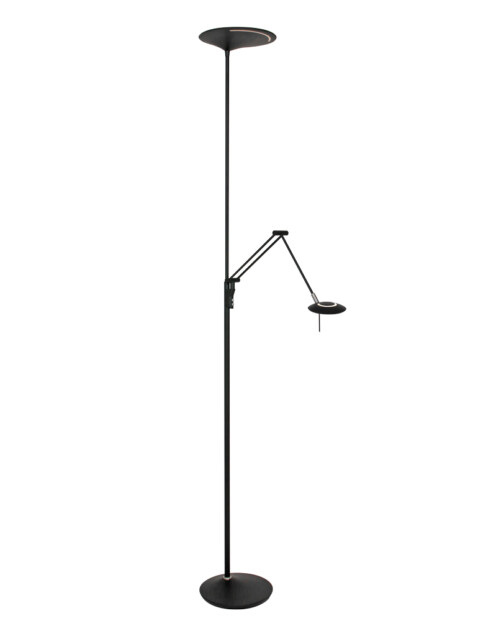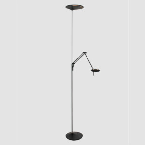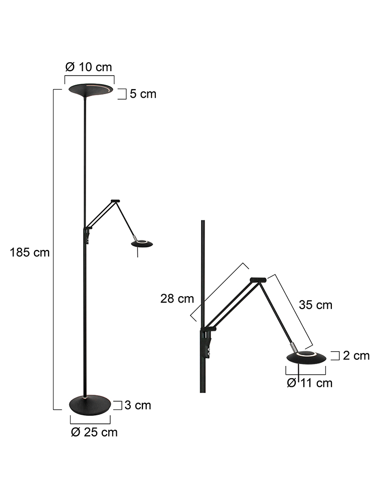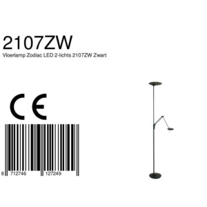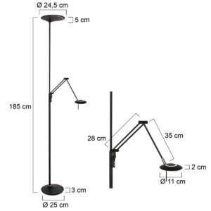 Esta lámpara de pie negra de la serie Zodiac cuenta con un uplighter y una lámpara de lectura, ambas equipadas con módulos LED reemplazables. La lámpara de lectura tiene un módulo LED de 6 vatios (2700 Kelvin, 700 lúmenes) y el uplighter tiene un potente módulo LED de 25 vatios (2700 Kelvin). Con el regulador de intensidad en el soporte, puedes ajustar ambas fuentes de luz por separado a la intensidad deseada. La lámpara tiene una altura de 185 cm y una base estable con un diámetro de 25 cm.