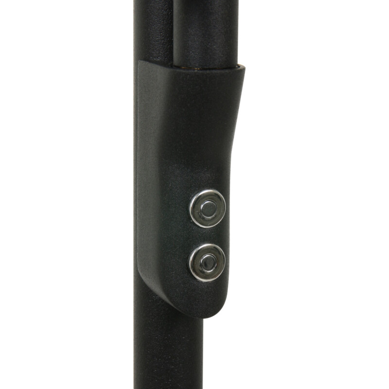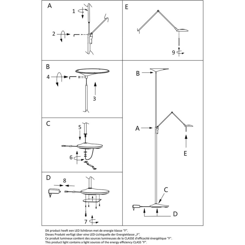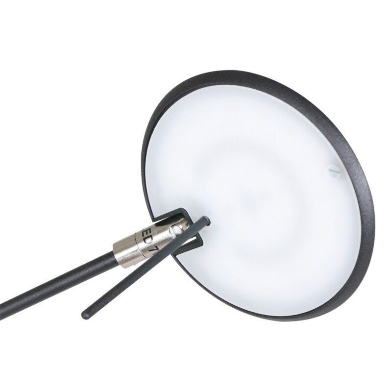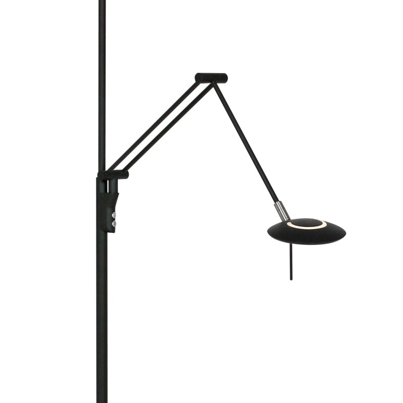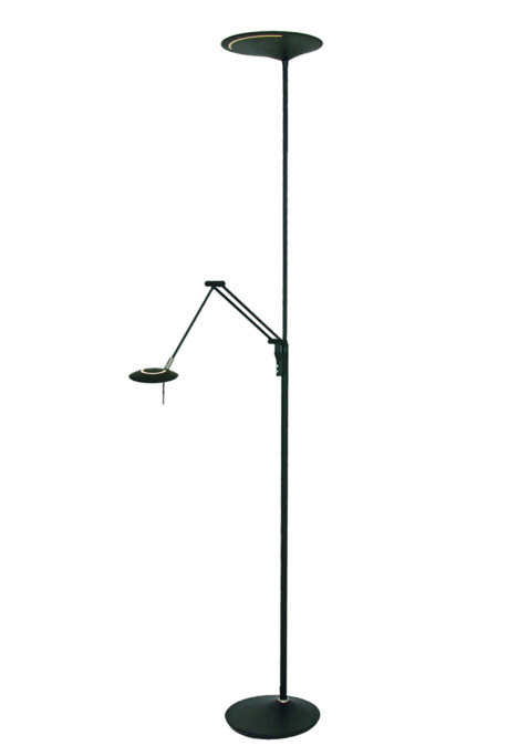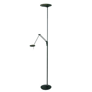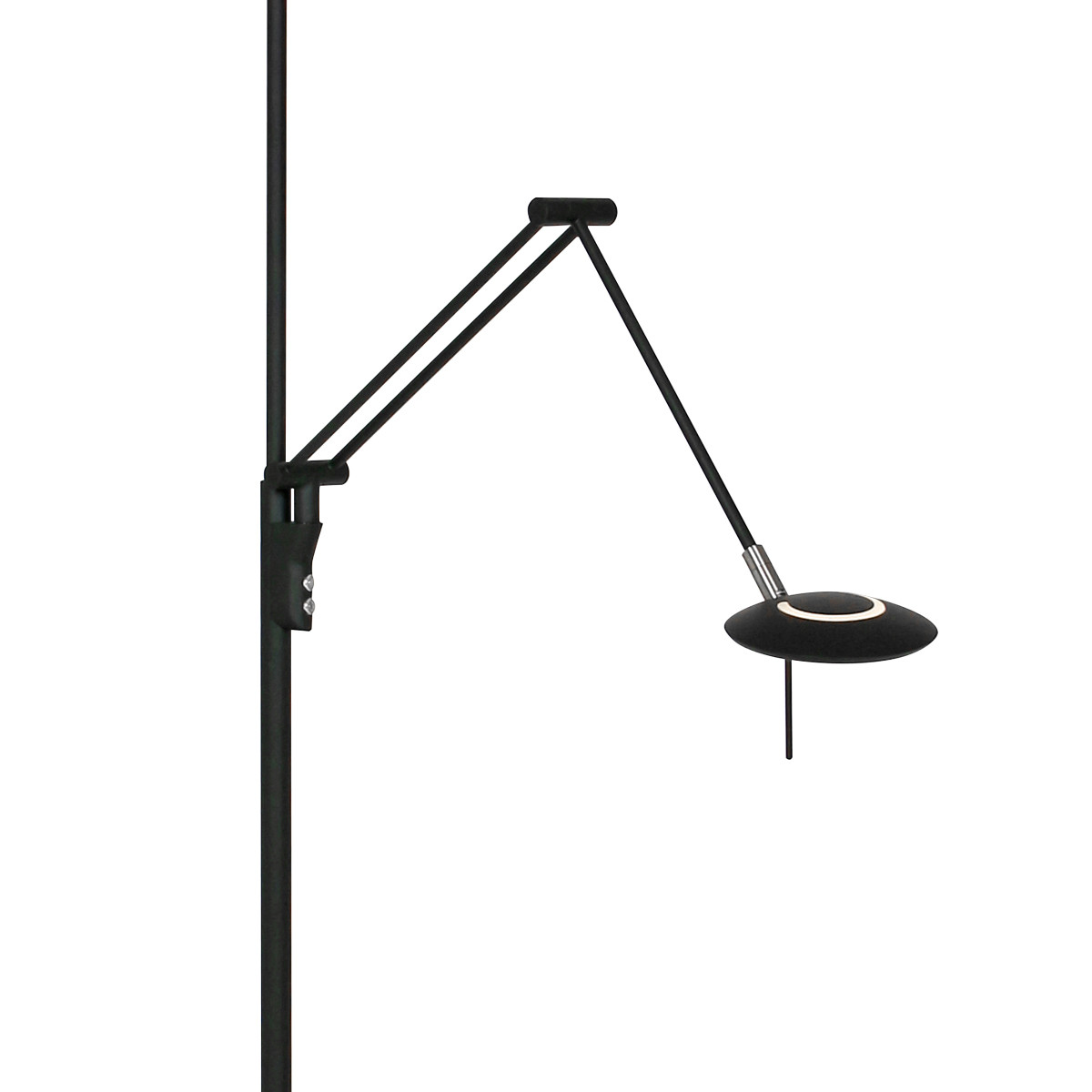 Esta lámpara de pie negra de la serie Zodiac cuenta con un uplighter y una lámpara de lectura, ambas equipadas con módulos LED reemplazables. La lámpara de lectura tiene un módulo LED de 6 vatios (2700 Kelvin, 700 lúmenes) y el uplighter tiene un potente módulo LED de 25 vatios (2700 Kelvin). Con el regulador de intensidad en el soporte, puedes ajustar ambas fuentes de luz por separado a la intensidad deseada. La lámpara tiene una altura de 185 cm y una base estable con un diámetro de 25 cm.