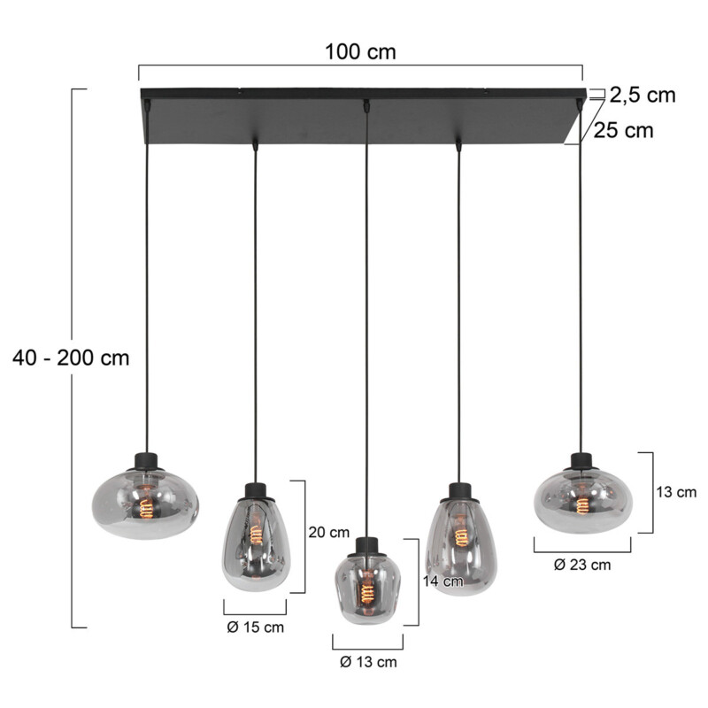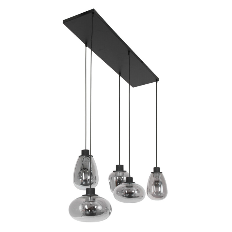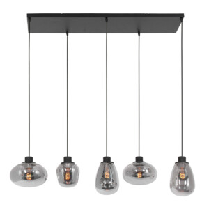 La lámpara colgante Reflexion de 5 luces ofrece una combinación refinada de diseño moderno y una iluminación acogedora. La lámpara tiene cinco casquillos E27, cada uno equipado con un sutil vidrio ahumado reflectante. Los vidrios varían en forma y altura, lo que crea un efecto juguetón. Con un ancho de 100 cm y una altura ajustable de 40 a 200 cm, esta lámpara es perfecta sobre la mesa del comedor. Combínala con fuentes de luz regulables y un regulador externo para ajustar el ambiente a tu gusto.