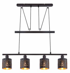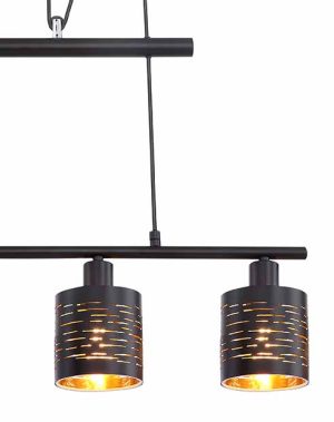 Cuelgue esta moderna lámpara colgante TUNNO en su cocina o sala de estar para crear un ambiente cálido con su interior dorado y detalles decorativos. La lámpara es regulable en altura y cuenta con cuatro casquillos E14 para un control máximo de la luz.
