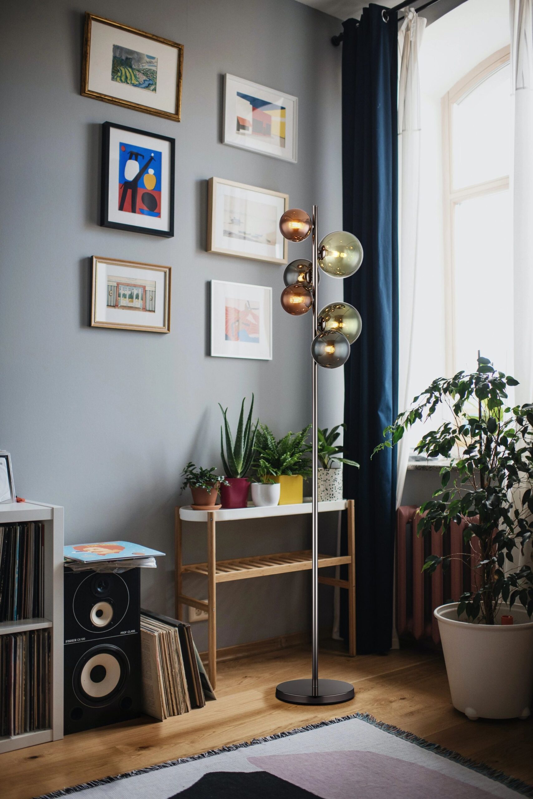 Con una potencia lumínica de 290 lúmenes, la lámpara de pie ofrece la claridad adecuada para iluminar su hogar. Los colores únicos de las esferas de vidrio, como bronce, verde y petróleo, añaden un toque de estilo y color a cada espacio. Además, la base con conexión de interruptor en el cable facilita encender y apagar la lámpara. Descubra la lámpara de pie RIHA y brinde a su interior un aspecto radiante.