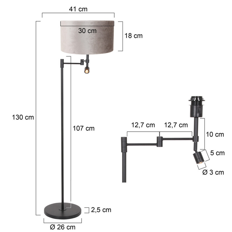 Ambas fuentes de luz se pueden encender por separado con interruptores en el casquillo y en el tubo de pie. Gracias al brazo ajustable, la iluminación se puede adaptar fácilmente al espacio. Con una altura de 120 cm, un diámetro de base de 26 cm y una longitud de cable de 180 cm, esta lámpara de pie es perfecta para interiores modernos, ya sea en la sala de estar, el comedor o un elegante lugar de trabajo.