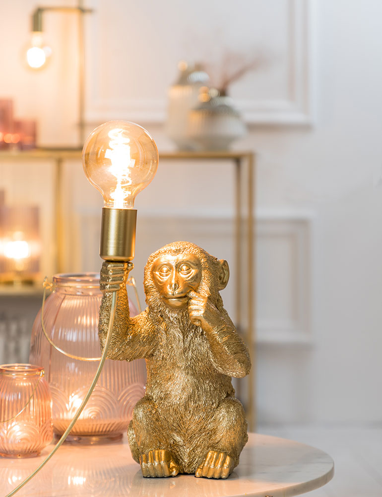 Su color dorado y su original forma de mono hacen de este portalámparas un objeto especialmente adecuado a ambientes de estilo glam, eclécticos o clásicos. También se puede integrar estupendamente en un salón de estilo étnico, siempre que se incluya algún otro elemento dorado, como una mesa auxiliar de esencia marroquí o un aplique de pared de acabado color oro.