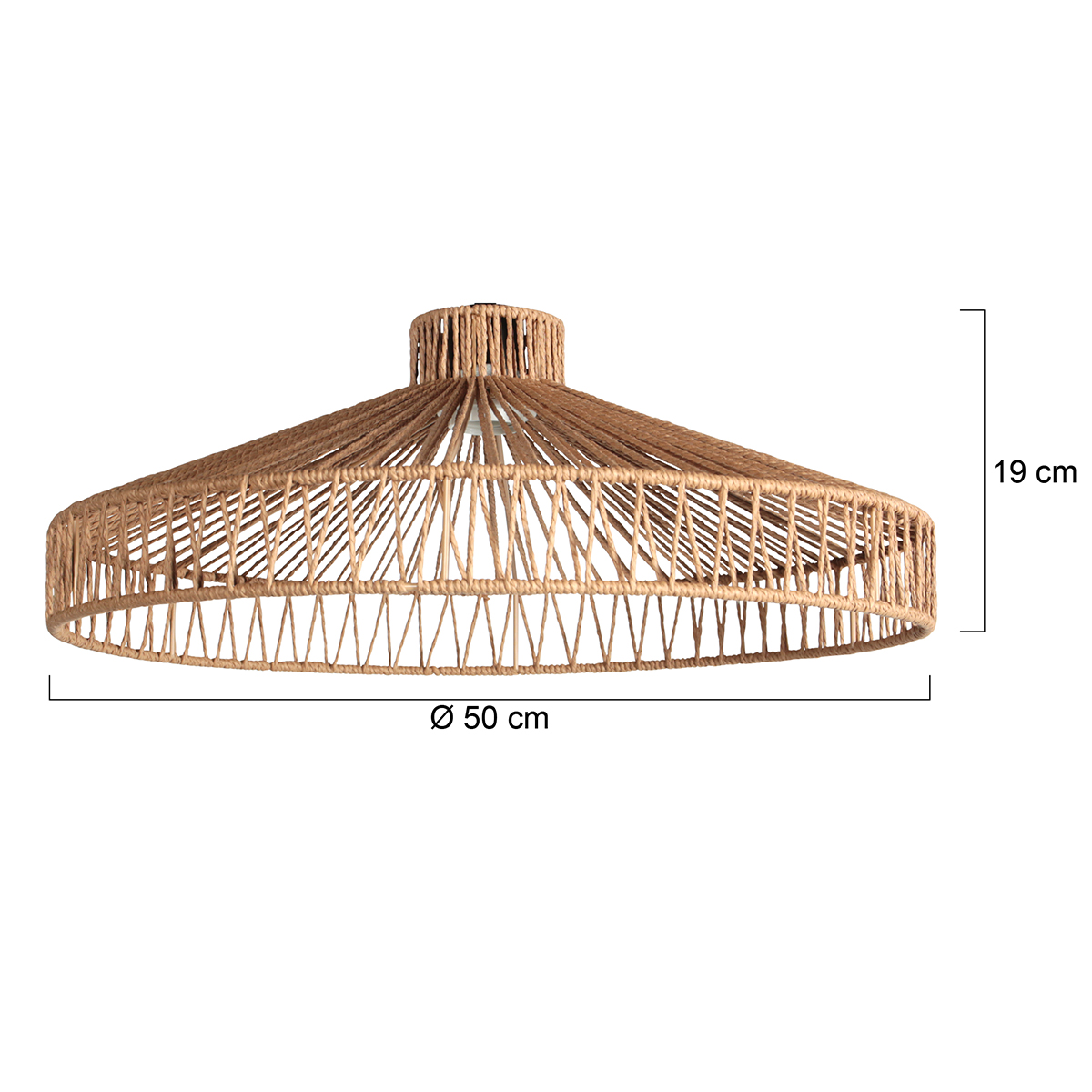 Esta pantalla de lámpara de cuerda de 50 cm de ancho y 19 cm de alto tiene una estructura abierta y trenzada que crea un juego de luces divertido en las paredes y el techo. El color natural de la cuerda aporta un ambiente bohemio y playero a tu interior.