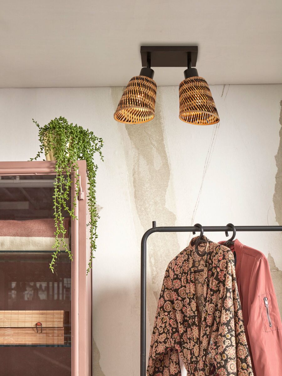 Plafón de bambú en negro y natural, estilo bohemio, adecuado para comedor, pasillo, (home) oficina, cocina, dormitorio o sala de estar. Equipado con dos grandes casquillos E27 y a prueba de polvo (IP20). Esta lámpara combina una apariencia exótica con una elegancia moderna. La mezcla de bambú negro y natural proporciona una adición visualmente interesante y elegante a tu interior.
