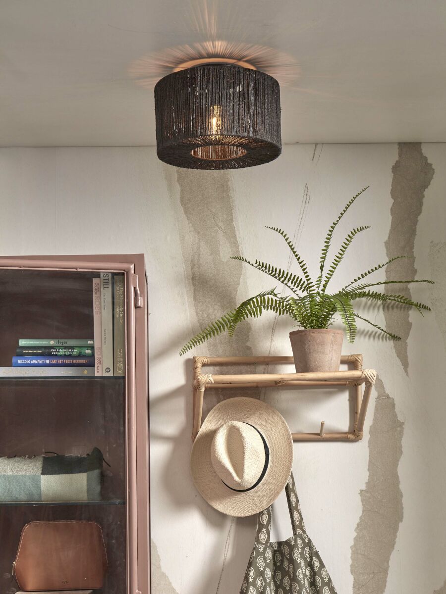 Plafón de mimbre negro en estilo bohemio, perfecto para el comedor, el pasillo, el dormitorio o la sala de estar. Equipado con un casquillo grande E27 y a prueba de polvo (IP20). Esta lámpara combina materiales naturales con un toque moderno para una apariencia única.