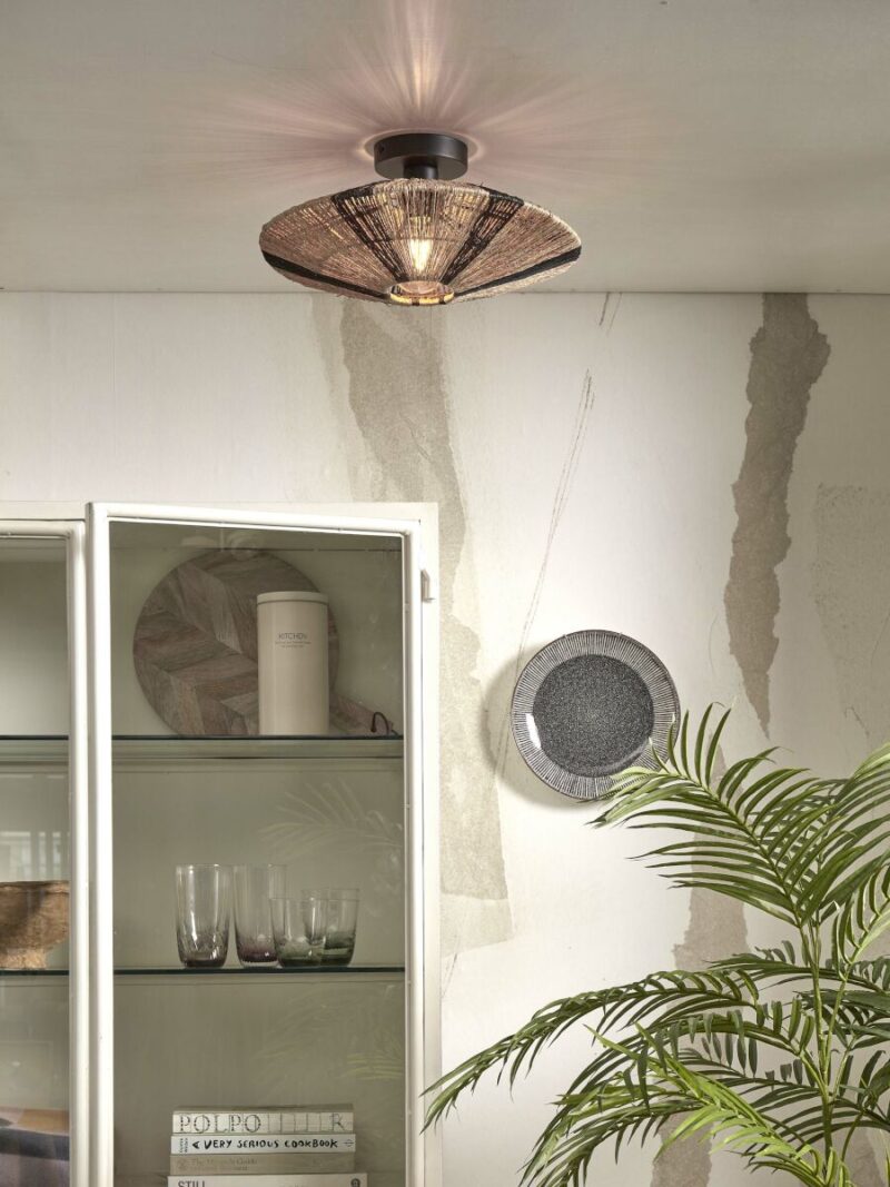 Plafón bohemio de caña natural y negra, ideal para comedor, pasillo, dormitorio o sala de estar. Equipado con un gran casquillo E27 y a prueba de polvo (IP20). Agrega un ambiente cálido y exótico a tu interior con esta elegante lámpara.