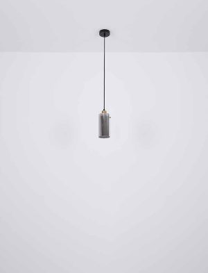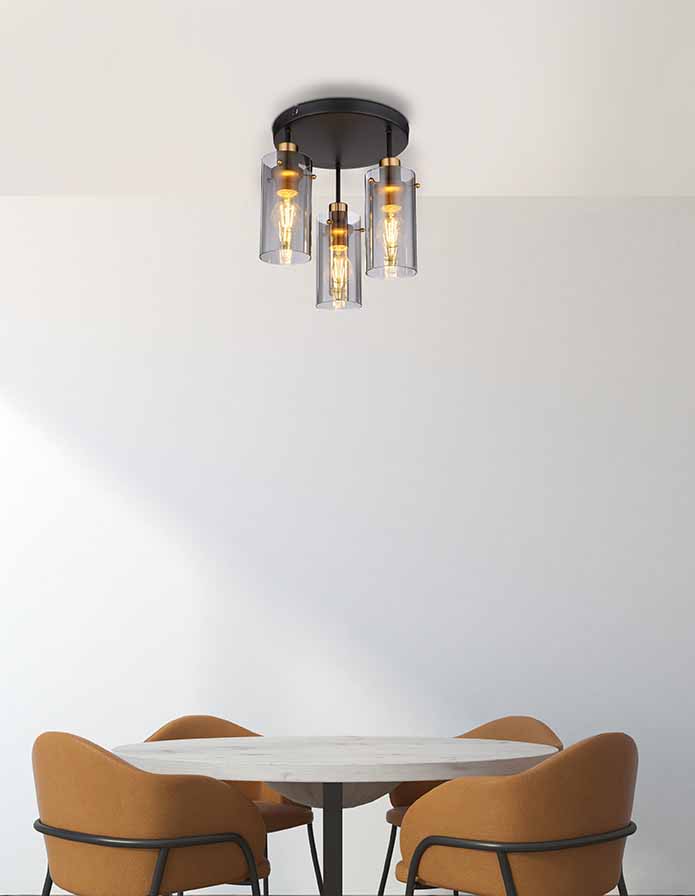Esta lámpara de techo de la serie Fanni, con un soporte redondo negro mate (Ø30cm) y tres portalámparas E27, cuenta con elegantes pantallas cilíndricas en colores ahumados con adornos de latón. Una elección ideal para ajustar el color de la luz y la luminosidad en su sala de estar.