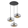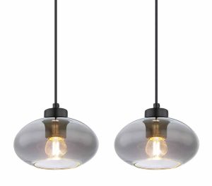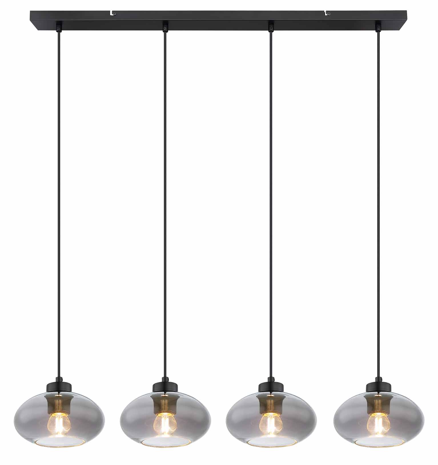 Esta elegante lámpara colgante de la serie SHAUN cuenta con un esbelto soporte de techo negro (96x18cm) del que cuelgan cuatro cables negros hacia cada casquillo E27, equipados con una pantalla ovalada de vidrio ahumado. Elige tú mismo el color de la luz y la intensidad hasta un máximo de 40 vatios.