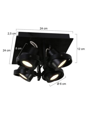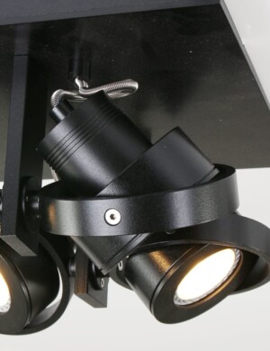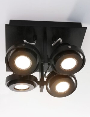 Foco ajustable de 4 luces en negro de la serie Quatro, ideal para interiores modernos e industriales. Este foco de superficie es tanto giratorio como inclinable, lo que te permite dirigir la iluminación perfectamente. Adecuado para montaje en pared o techo y equipado con cuatro bombillas LED de 7 vatios de bajo consumo. Con su diseño negro elegante, se integra fácilmente en la sala de estar, cocina, pasillo u oficina. Además, este foco es adecuado para el baño en la zona 3.
