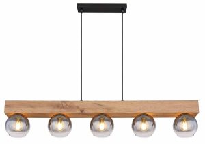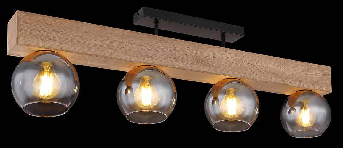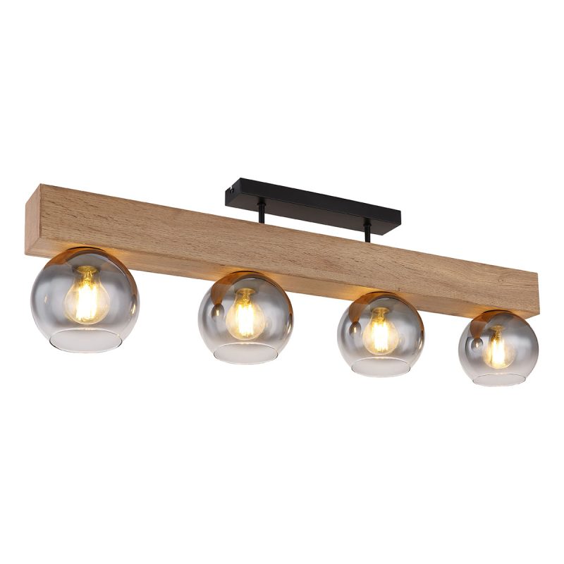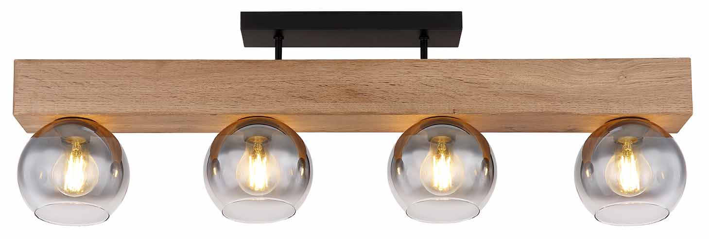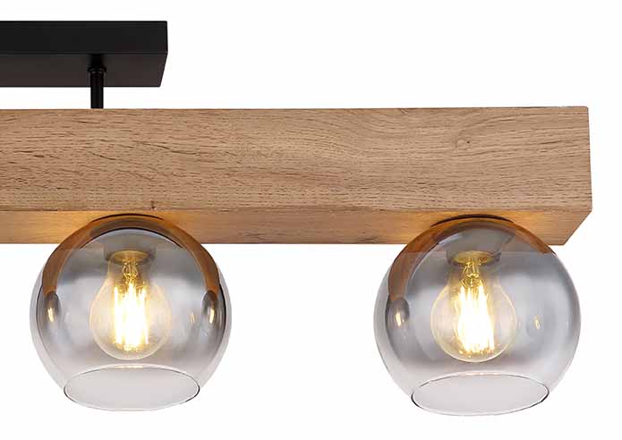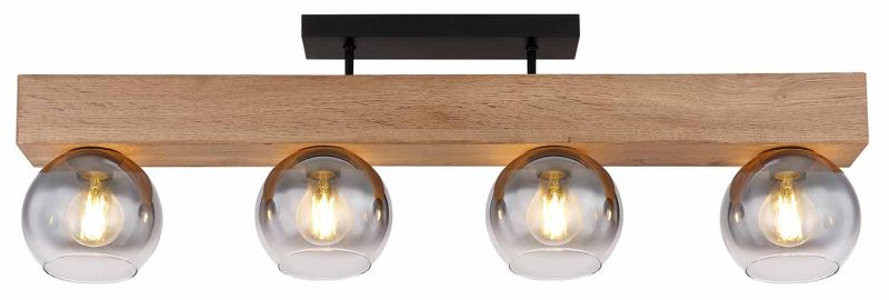 Esta hermosa lámpara de techo de la serie MOITAS inspira con un diseño increíble. Dos cortas varillas metálicas sobresalen de un anclaje rectangular negro hacia un bloque con apariencia de madera (90x15cm). Hay cuatro casquillos E27, cada uno con una cubierta de vidrio en colores ahumados. Con los conectores E27, puedes determinar el color y la intensidad de la luz hasta una potencia máxima de 40 vatios.