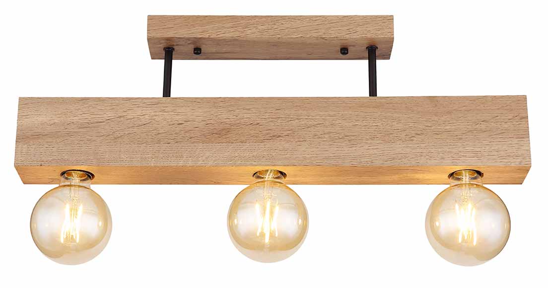 Esta lámpara de techo atemporal inspira con su hermoso diseño de madera. La lámpara consta de tres casquillos E27 que sobresalen de un bloque de madera de 60 cm de longitud y cuelga a 20 cm del techo mediante dos varillas metálicas negras. Con los conectores E27, puede utilizar bombillas de su elección, hasta un máximo de 60 vatios.