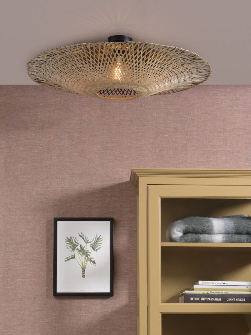 Plafón bohemio de bambú en natural y negro, ideal para el comedor, el pasillo, el dormitorio o la sala de estar. Equipado con un gran casquillo E27 y a prueba de polvo (IP20). Añade un ambiente cálido y exótico a tu interior. Esta lámpara crea un entorno acogedor y elegante.