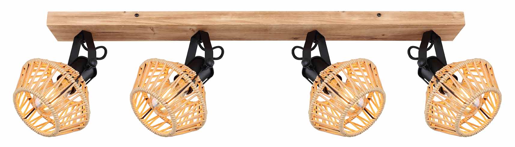 Destáquese con este elegante foco diseñado para enriquecer su interior. Cuenta con cuatro bisagras de color negro mate que están unidas a un esbelto soporte de techo con un hermoso acabado en madera, dimensiones 80x16cm. Cada bisagra tiene un casquillo E27, hábilmente protegido por un paraguas texturizado con lirio de agua (Ø15.5cm). Gracias al casquillo E27, puede elegir el color y la intensidad de la luz hasta un máximo de 60 vatios. Combine esto con otros modelos de la misma serie para un acabado armonioso de su espacio vital.