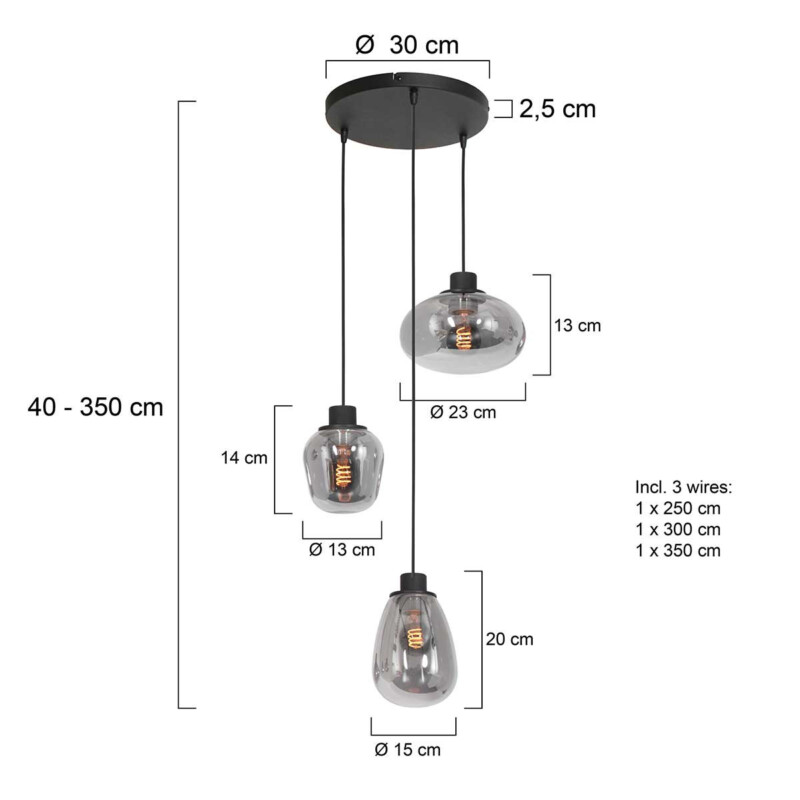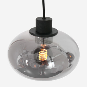 La lámpara colgante Reflexion de 3 luces es un complemento elegante para cualquier interior. Las tres lámparas de vidrio ahumado con casquillos E27 cuelgan de una placa de techo rectangular y varían en forma y altura, lo que les da un aspecto juguetón. El diámetro de la lámpara es de 40 cm y los vidrios son ajustables en altura de 30 a 370 cm. Gracias a la generosa longitud del cable, esta lámpara también es perfecta como iluminación de altillo. Regulable con un regulador de pared y una fuente de luz adecuada.
